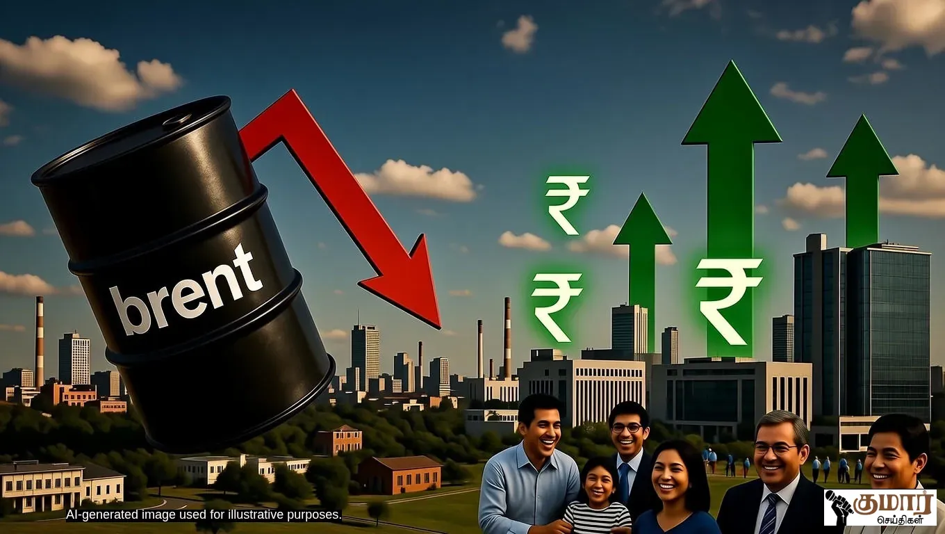 டிசம்பர் 2025ல் Brent Crude விலை $60 க்கும் கீழ் சரிந்து இந்திய பொருளாதாரத்திற்கு நன்மை. இறக்குமதி செலவு குறைவு, பணவீக்கம் கட்டுப்பாடு, சில துறைகளின் லாபம் அதிகரிப்பு போன்ற பலன்கள்.